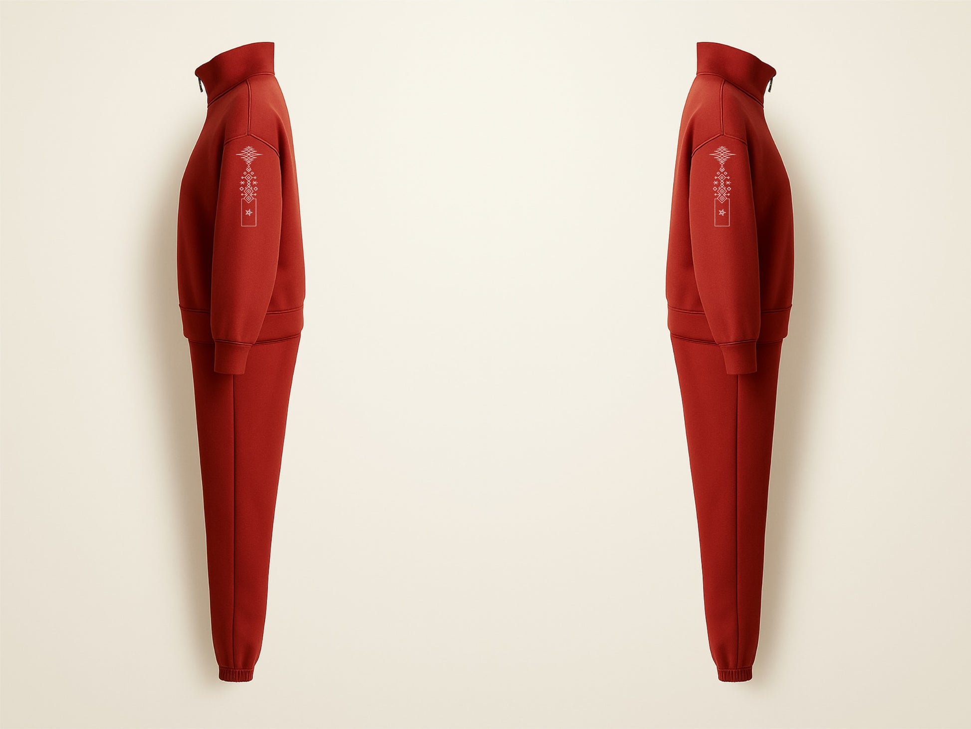 The pants complete the story with subtle Amazigh-inspired symbols placed vertically — rooted, balanced, intentional.